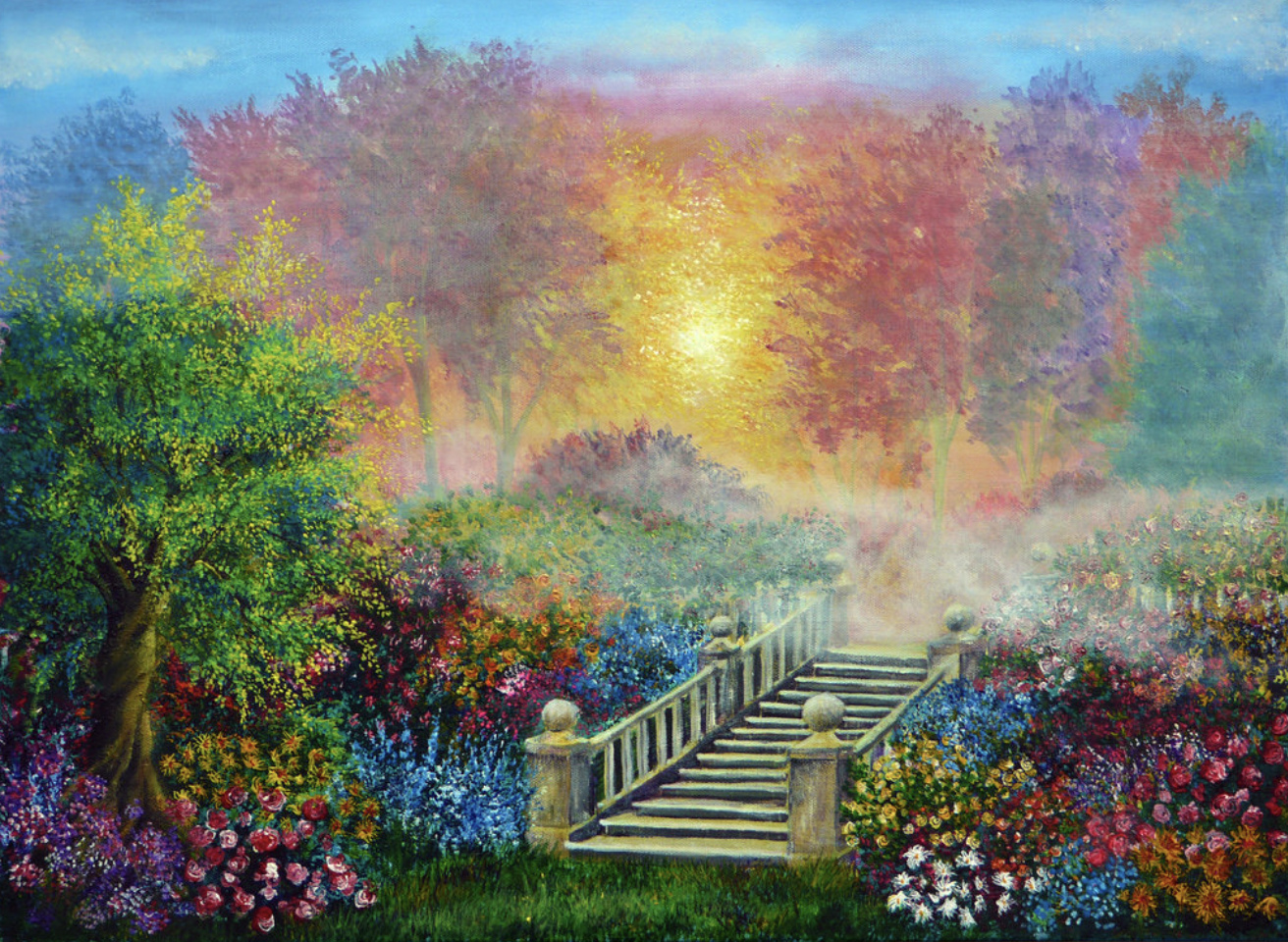 濃いイチイの木の前に広がる明るい色の雑草、忘れていたたんぽぽが庭のずっと向こうで花を咲かせる、蒼い忘れな草の中で完璧な色合いを見せて、ぶどうのつるが木登りを始め、真紅の彩りを添える。