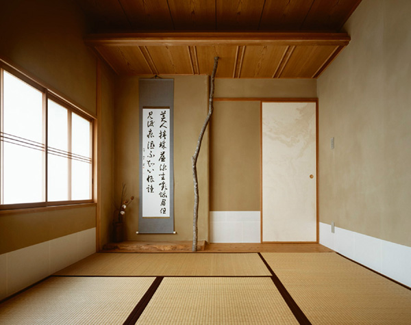 変化のある表現として、自然木をそのまま用いた床柱を。(写真右)