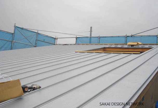 神奈川県大和市に設計した「SKY CUBE」。 現在、屋根工事と防水工事が進んでします。 この住宅は片流れのシンプルな屋根デザインで、ガルバリウムの素地を使っています。 南側の前面道路から建物を見上げると、屋根の軒裏がとても目立つため、その納まりと素材カラーに一工夫しています。 (つづく)