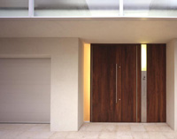 ウォールナット無垢材で袖パネルも一体に製作したシンプルな玄関扉、スリガラスのスリットから明かりが漏れている。